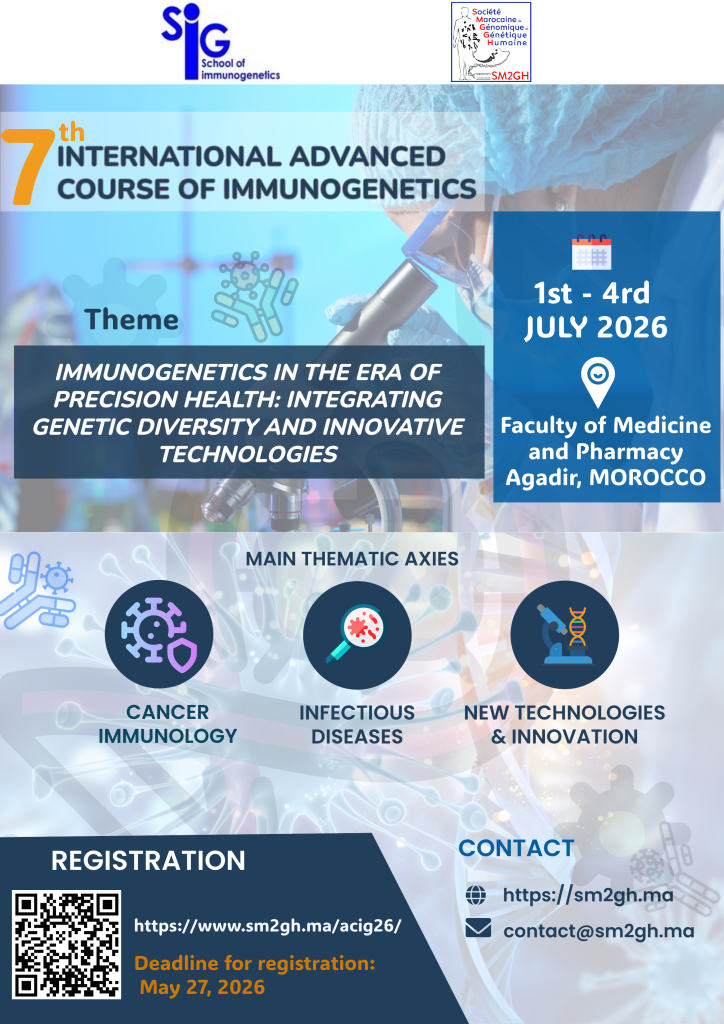 The 7th International Advanced course of Immunogenetics (SIG 2026), organized by the School of Immunogenetics (SIG) and Moroccan Society of Genomics and Human Genetics (SM2GH), is a high-level scientific training program designed to bring together leading experts, early-career researchers, clinicians, and students from around the world.
